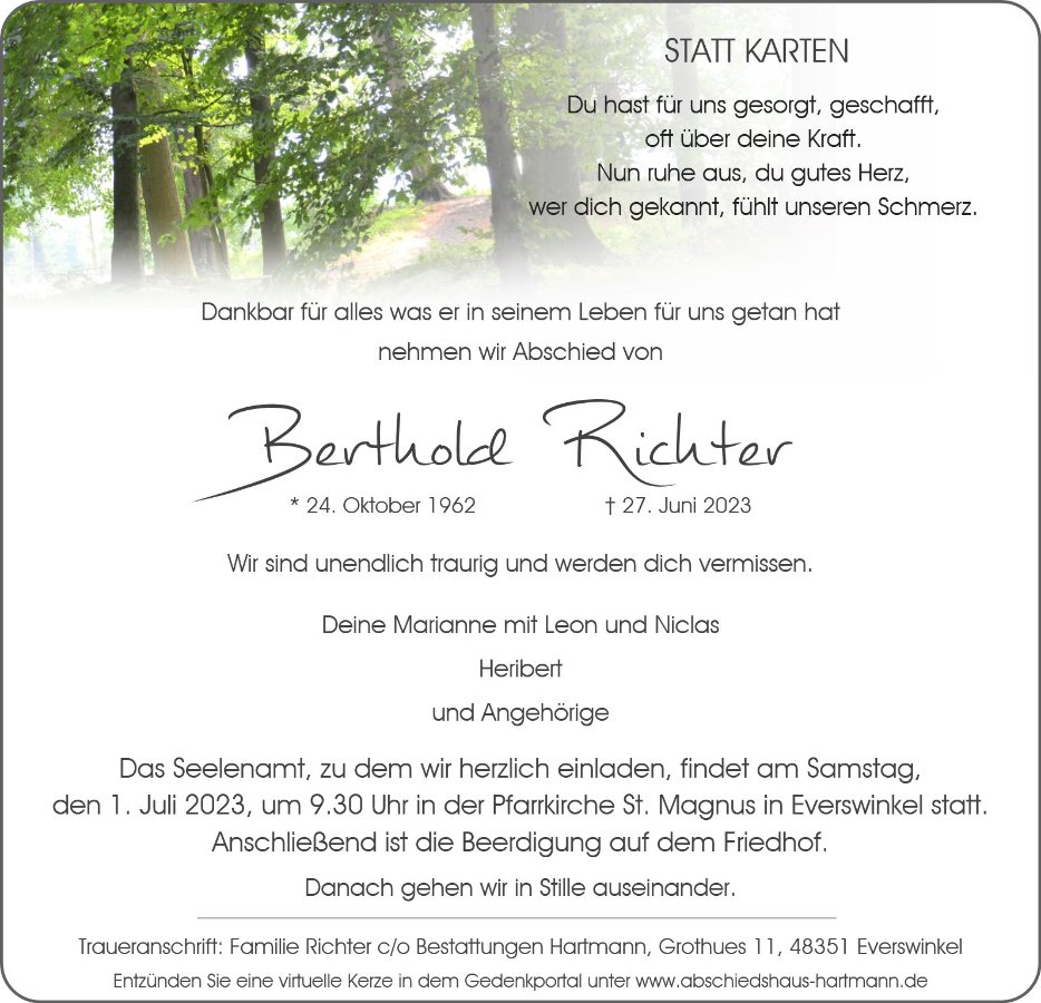 Wir haben als „Zugezogene“ Berthold als liebenswertes, gestandenes und humorvolles Münsterländer Original“ kennenlernen dürfen und haben ihn sehr geschätzt! Wir werden ihn nie vergessen!