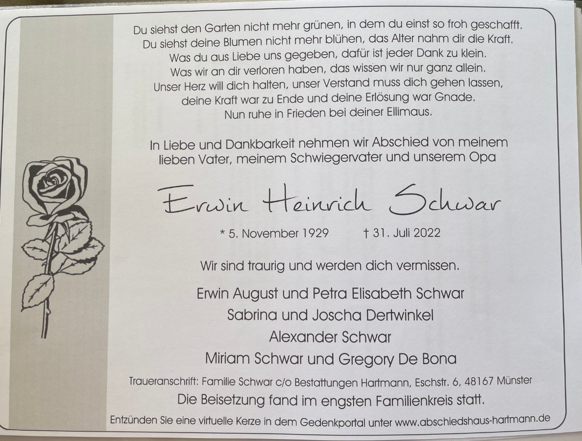 Es ist noch nicht solange,da habe ich auch die Anzeige ihrer lieben Mutter und Oma gelesen.Ich kannte ihre Eltern beide sehr gut.Manchmal haben wir uns in den Frühstunden von meiner Tätigkeit als Zeitungsbotin an der Haustür getroffen.Da wohnten ihre Eltern noch auf dem Nienkamp 5