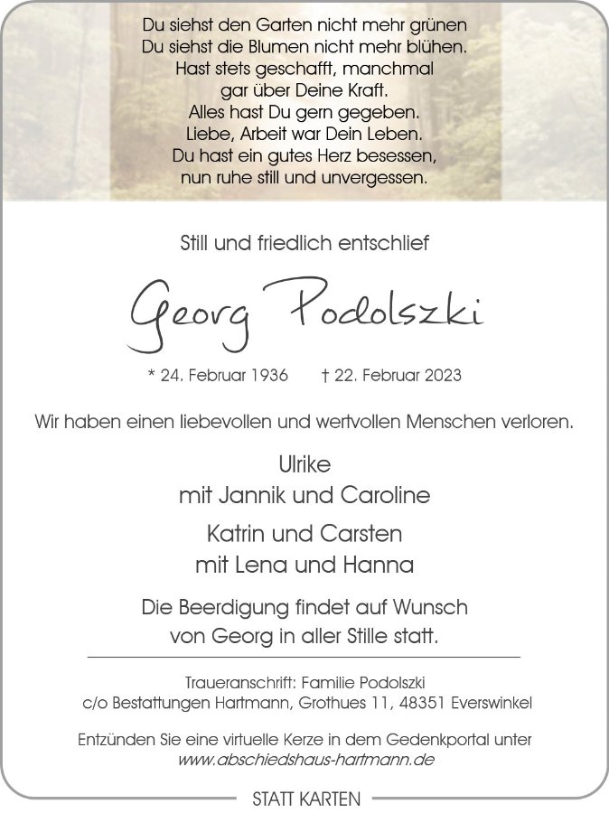 Sprechen Sie im Kondolenzbuch den Hinterbliebenen Ihr Beileid aus und teilen Sie persönliche Gedanken und Erinnerungen mit anderen.