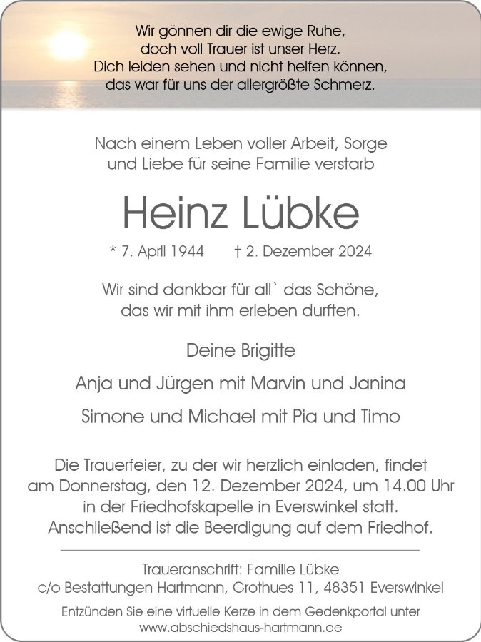 Liebe Brigitte (Neffken), herzliches Beileid ! Hast einen sehr guten Mann gehabt ! Alles Gute für Deinen weiteren Lebensweg wünscht Dir und Deinen Lieben Mechtild (Mecki) Bölting!
