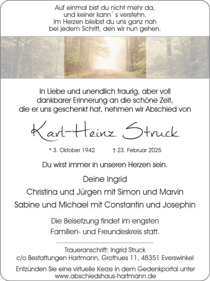 Der Verlust ist schmerzhaft, aber die Erinnerungen an gemeinsame Zeiten schenken Trost. Möge dieses Licht der Kerze symbolisieren, dass Karl-Heinz auch weiterhin einen Platz in unseren Gedanken und Herzen hat. Wir wünschen allen die Kraft und die Ruhe den Verlust Tag für Tag erträglicher werden zu lassen.