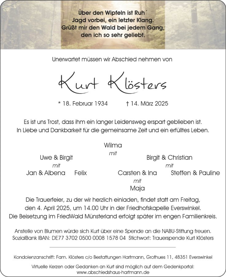 Trauerfeier ohne Beisetzung, Friedhofskapelle Everswinkel