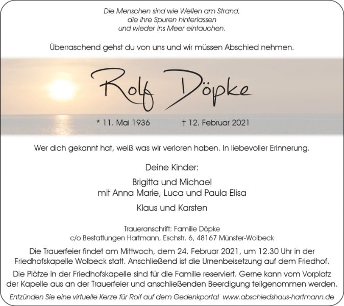 Lieber Herr Döpke, ich wünsche Ihnen auf Ihrer letzten Reise alles erdenklich Liebe und Gute. Ich bin dankbar Sie kenngelernt zu haben und werde unsere gemeinsamen Gespräche sehr vermissen. Sie waren ein lebensfroher und sehr aufgeschlossener Mann mit Liebe zur Musik. Ich bin dankbar dafür, dass Sie mir einmal vorspielen konnten. Heute trinke ich eine Tasse Kaffee und esse ein Stück Kuchen zu Ihren Ehren und denke dabei an unser letztes Zusammentreffen. Ich wünsche Ihrer Familie, Freunden und Bekannten alle Kraft um den Verlust von Ihnen zu überwinden und das sich die Tränen bald in freudige Erinnerungen verwandeln mögen.