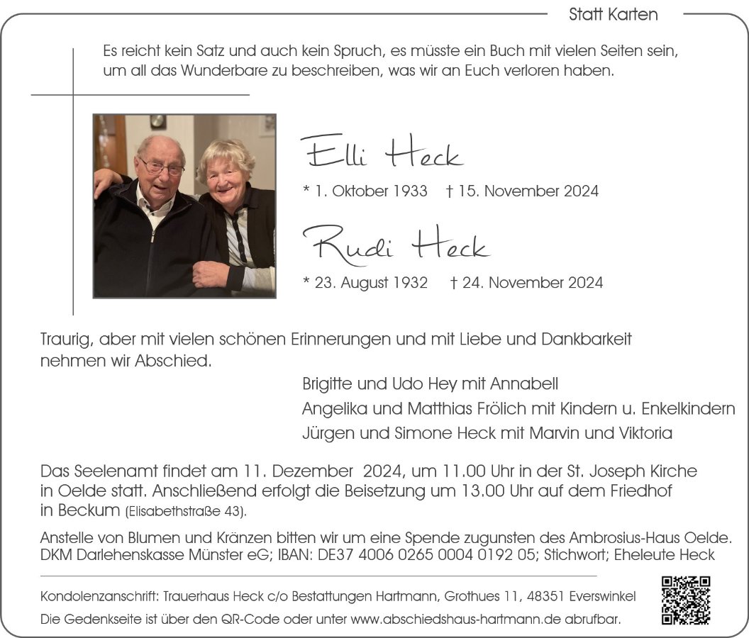 Wir haben sie als liebenswerte Menschen schätzen- und kennengelernt, die stets ein freundliches Wort und viel Verständnis für die Sorgen anderer hatten. Ihr Tod wird eine große Lücke im Kreis der Familie und Freunde hinterlassen, die schwer zu schließen ist.