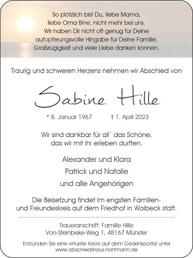 Ich wünsche Sabines Familie, dass die Trauer bald zur liebevollen Erinnerung wird.